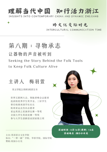 为弘扬“闻道中华,语美天下”的浙外精神,助力青年员工深入理解当代中国,知行活力浙江,讲好中国故事、浙江故事,传播好中国声音、浙江声音,来利国际旗舰厅将继续在校园小石光开展“跨文化交际时光”系列活动。新一期的跨文化活动将于5月16日举行。本次活动主讲人梅羽萱将带领我们走近中国民俗器具,讲述它们的发现地点、起源以及背后的历史故事,展现中国民俗文化在物质乃至精神层面的凝聚力和包容性。中国民俗文化植根于普罗大众的日常生活,见证了中华民族的发展变迁,体现着人民对美好生活的向往。