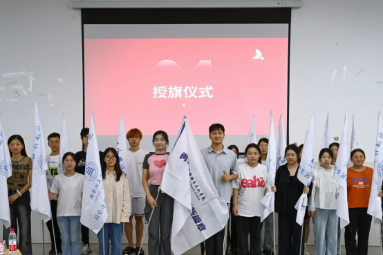 伴随着庄重的乐声奏响,顾蒙为实践团队领队代表叶嘉琪授旗,各团队代表领取旗帜,旗帜在空中划出一道道有力的弧线,象征着每位同学参与暑期社会实践的坚定决心。