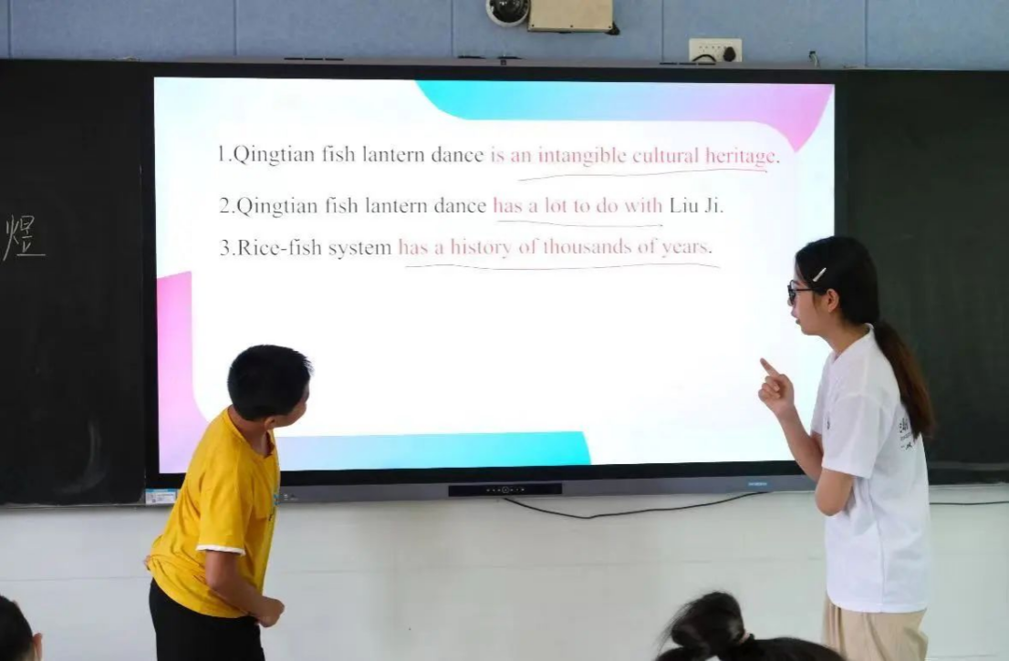 "Hi everyone, what do you want to draw on the fish lantern for your parents overseas? "(各位小朋友,你们想在鱼灯上画什么送给在国外的爸爸妈妈呢?)7月8至7月20日,来利国际旗舰厅赴浙江丽水青田县赋能乡村振兴暑期支教团队来到青田县方山乡公司,给当地“洋留守”儿童带来为期两周的“鱼灯舞动,文化薪传”系列课堂。团队聚焦当地非遗——青田鱼灯舞,结合自身外语专业优势,开设一系列外语融合鱼灯舞课程,给予这群父母远在国外的孩子更多关心和陪伴,也帮助他们更靠近家乡传动文化。