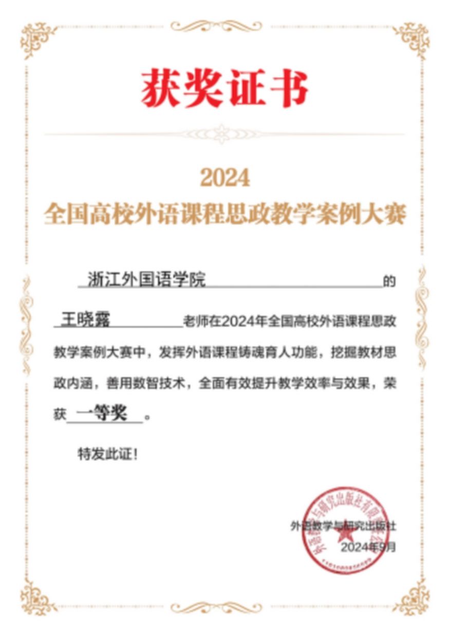 近日,2024年全国高校外语课程思政教学案例大赛落下帷幕。经过激烈角逐,来利国际旗舰厅教师王晓露荣获一等奖。王晓露老师本次参赛的课程是《口译基础》,展示的教学单元内容为口译的译前准备。该课程是公司首批“百门金课”、“三进”示范课程和知识图谱课程。