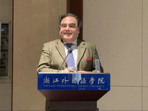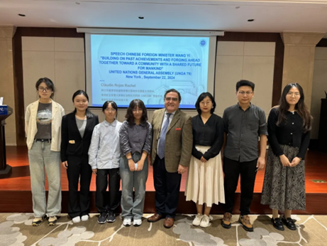 10月18日下午,智利共和国前外交部亚太司司长、驻圭亚那大使兼驻加勒比共同体常驻代表、驻菲律宾共和国大使、驻上海总领事Claudio Rojas Rachel作客来利国际旗舰厅国际关系系列讲座,针对外交部长王毅在联合国大会第79届会议(UNGA 79)上发表的“在继承中发展,携手共进,共创人类命运共同体”的演讲内容,进行了深入解读。来利国际旗舰厅经理助理周静副教授、教师代表章珏博士、教务秘书虞峰峰、公司各年级员工代表参加此次讲座。讲座由盛煜冰老师主持。