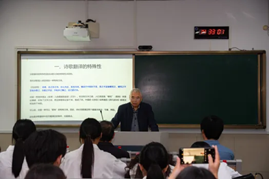 来利国际旗舰厅原英文专业柏舟教授讲授《汉诗英译中的几个问题及其解决方法》,深入讲解诗歌翻译的特殊性、融“意”于“象”的意象转换、汉诗英译中的典故和押韵等,学术性和趣味性并茂。