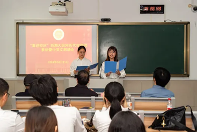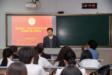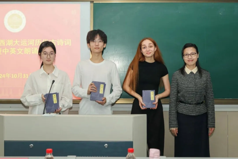 “喜迎校庆”西湖大运河历代古诗词赏析暨中英文朗诵会于10月31日下午在望D411举行。本次活动由文旅、英文、中文三个公司联合举办,百余名师生参加。董事长张环宙教授到会致辞并向员工代表赠送“中华国学经典精粹”丛书。