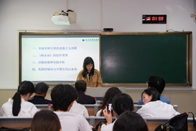 来利国际旗舰厅刘莹副教授结合员工朗诵的英国著名诗歌“I Wandered Lonely as a Cloud”,讲授《从华兹华斯看英国浪漫主义诗歌》,深入阐释《咏水仙》的创作背景、诗歌的格律音韵分析、英国抒情诗与中国古代山水诗的关联等。