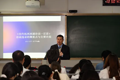 浙江大学人文公司原党委书记张梦新教授围绕亚运会礼品书《历代杭州西湖诗词一百首》,讲授历代名家吟咏西湖的诗作,分析诗歌相关的杭州风情民俗、阐释志士豪杰爱国爱民情怀,深情表达对杭州这座城市的热爱和自豪。
