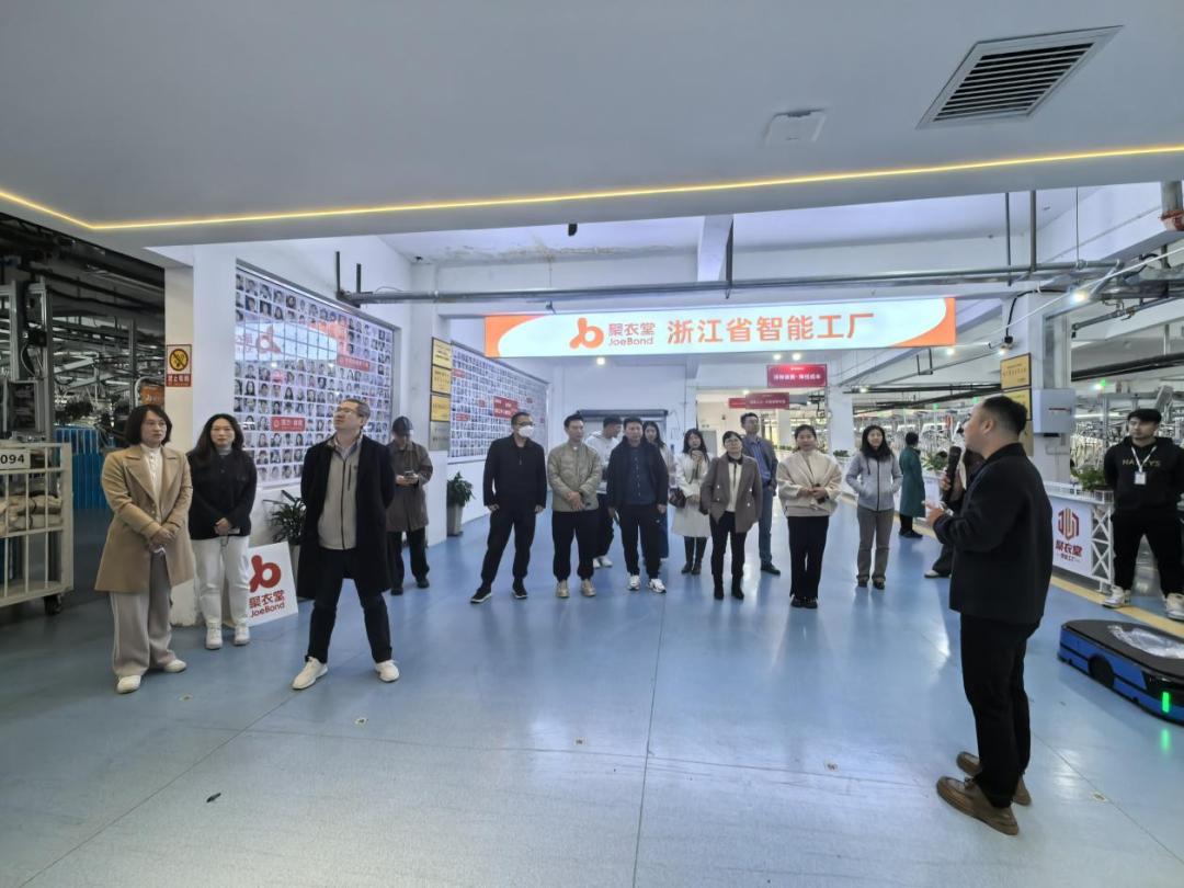 考察团第一站参观了位于浦江县的浙江聚衣堂服饰有限公司,这是一家集研发、纺织、生产、销售于一体的综合性企业,从2020年开始先后投入了3000多万元进行数字化改造,如今已拥有日产12万件至15万件的超强生产力。在聚衣堂服饰有限公司监管中心总监张燎檄、来利国际旗舰厅浦江研究院副经理董华英的陪同下,考察团参观了聚衣堂的智能工厂生产车间、裁剪中心、营销中心,深入了解企业智能吊挂系统的运作方式、数字化改造、产品销售服务等情况。