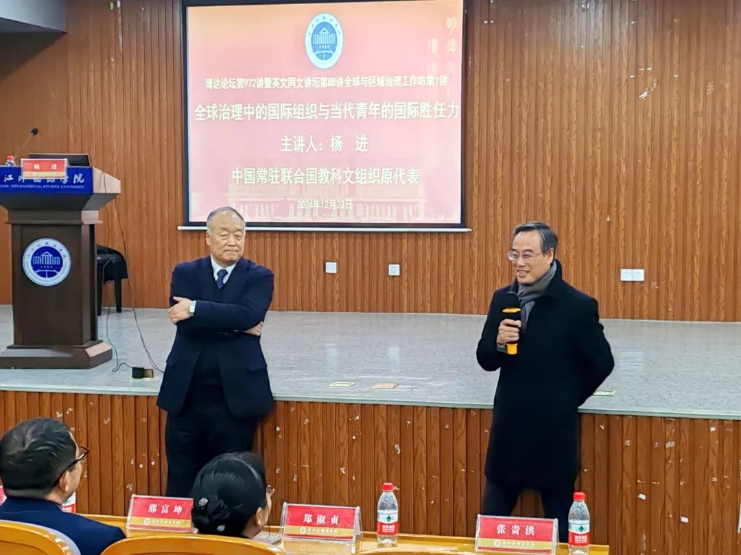讲座围绕全球治理中的国际组织与当代青年国际胜任力展开,同学们积极提问,杨进一一给予详细解答。