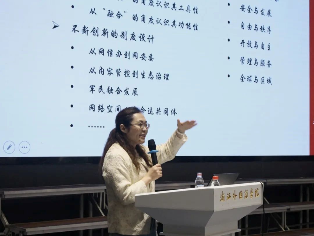 田丽教授系统梳理了农业革命、工业革命到信息革命的演进脉络,指出互联网作为新的生产工具,推动人类智力解放与科技革命。她特别强调,在国际竞争层面,网络空间已成为大国博弈的新边疆。中国作为后发国家,在大国冷战与技术博弈的双重冲击下,如何实现持续发展和弯道超车成为核心命题。