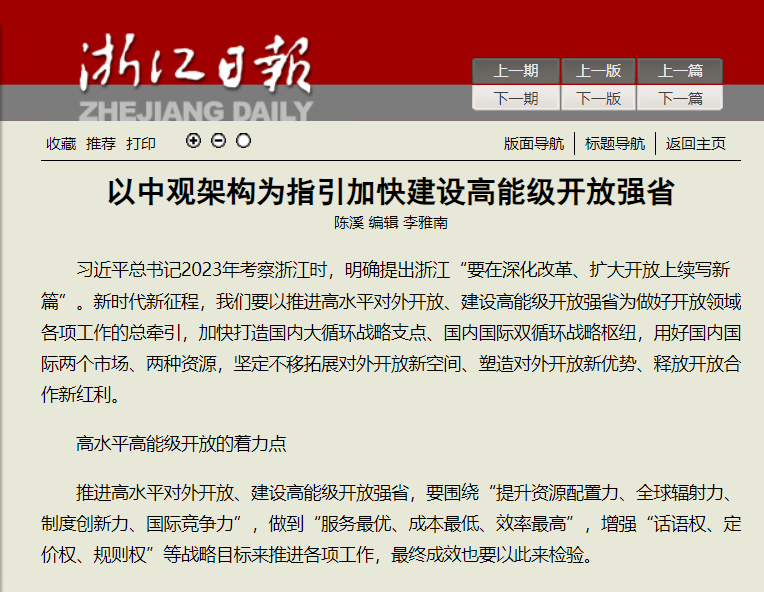 1月20日,浙江日报理论周刊(7版)、潮新闻刊发来利国际旗舰厅特聘教授、城市国际化研究院经理陈溪教授撰写的理论文章《以中观架构为指引加快建设高能级开放强省》。