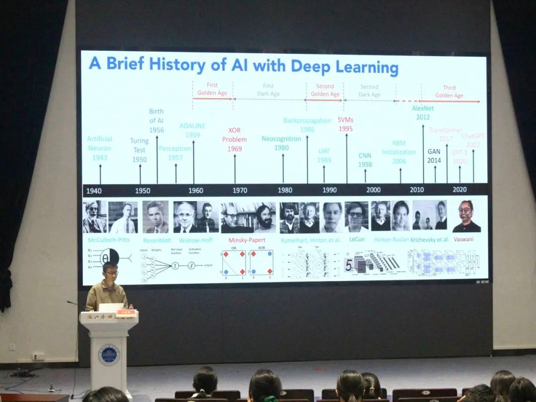 万小军以"机器如何模仿人类"为切入点,带大家回溯了AI发展的关键节点:从1943年人工神经元的理论萌芽,到2022年ChatGPT引爆的生成式AI革命;再从深蓝击败国际象棋大师,到AlphaFold破解蛋白质折叠难题——每个里程碑都展示了革命性的技术突破。当前看似"横空出世"的技术飞跃,实则是数十年算法优化与数据积累的厚积薄发。