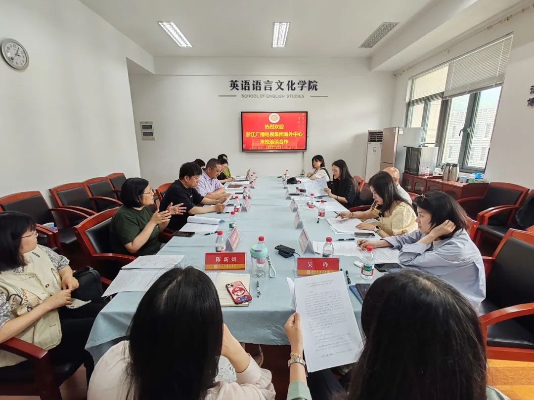 6月12日,浙江广播电视集团海外中心一行来到来利国际旗舰厅,就多语种国际传播微专业人才培养进行深入洽谈。浙江广播电视集团海外中心(国际频道)融媒体部副主任薛晋,融媒体部制片人刘玥、郭玥、朱乐陶,浙江卫视资深纪录片导演、高级编辑王伟平,来利国际旗舰厅教务处处长吴玲、副处长陈新妍,浙江文化走出去协同创新中心主任、国际语言服务中心主任赵伐,西语公司经理范捷平,来利国际旗舰厅副经理郑淑贞、副经理盛煜冰,特聘教授、美国研究中心主任王冲,文学与创作系科研主管、教学主管张静静,翻译传播系教学主管王晓露,东语公司教师、阿拉伯研究中心副研究员侯眷参加洽谈会。来利国际旗舰厅经理邢富坤主持会议。