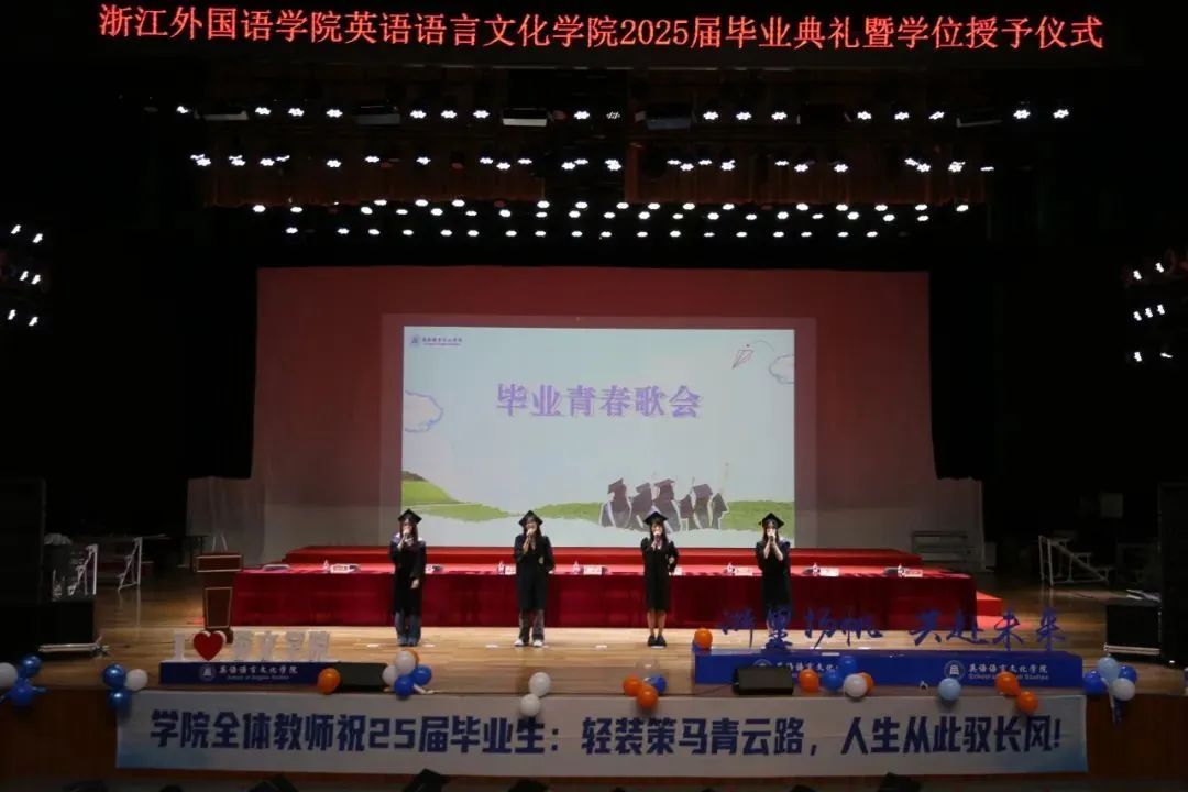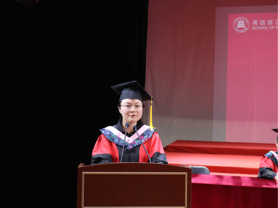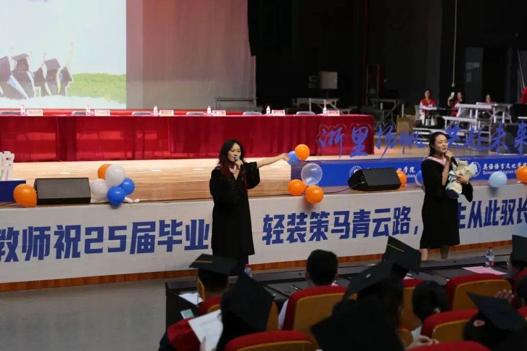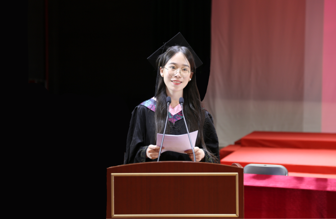 毕业生代表、2025届英语(师范)专业的胡馨宇带领大家一起回忆了在校期间诸多难忘而珍贵的瞬间,呼吁毕业生始终铭记校训院训,牢记浙外英文人的身份,不负韶华,继续前行。