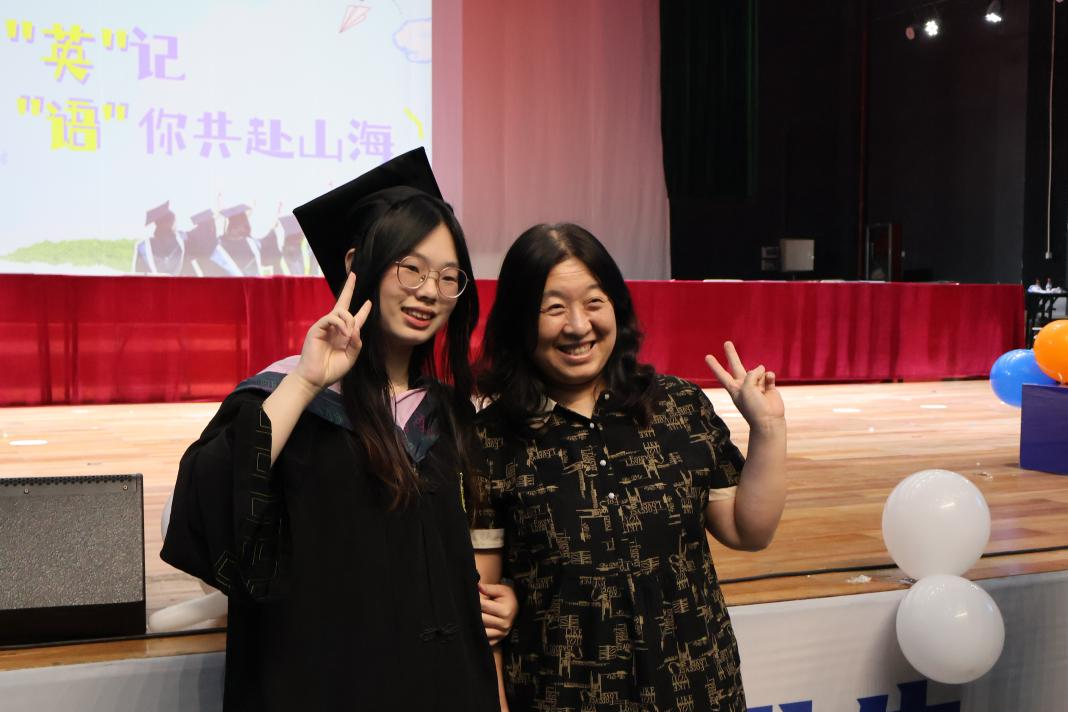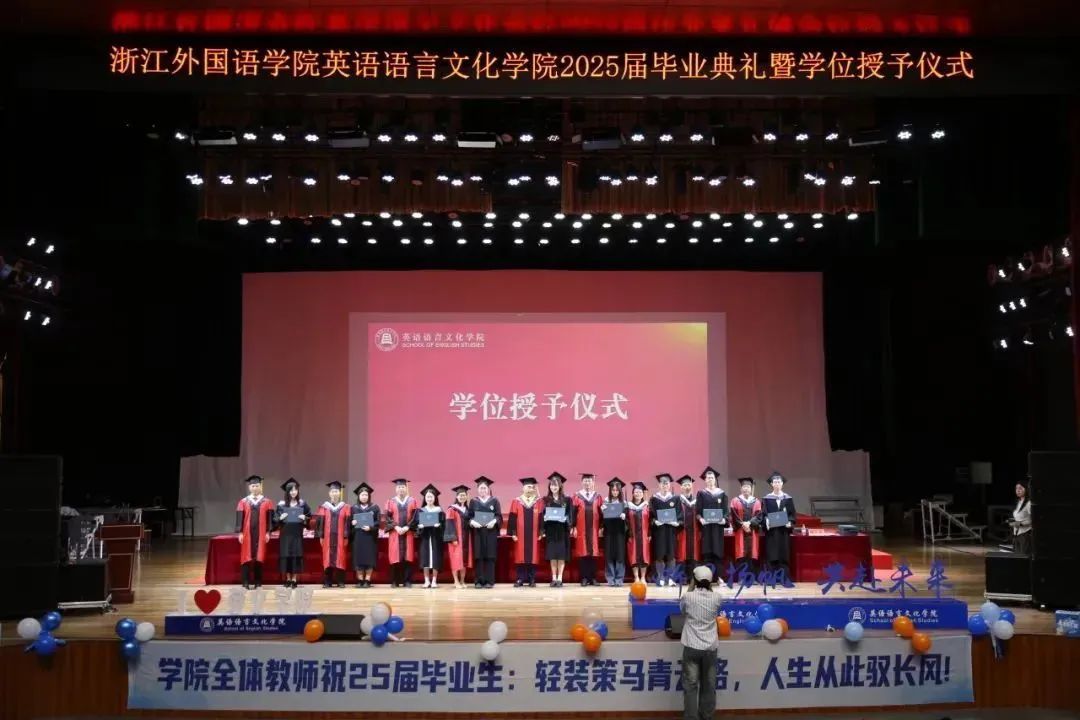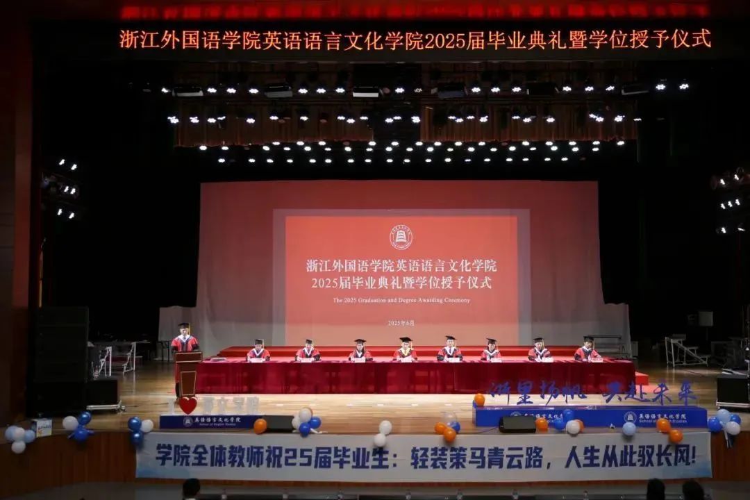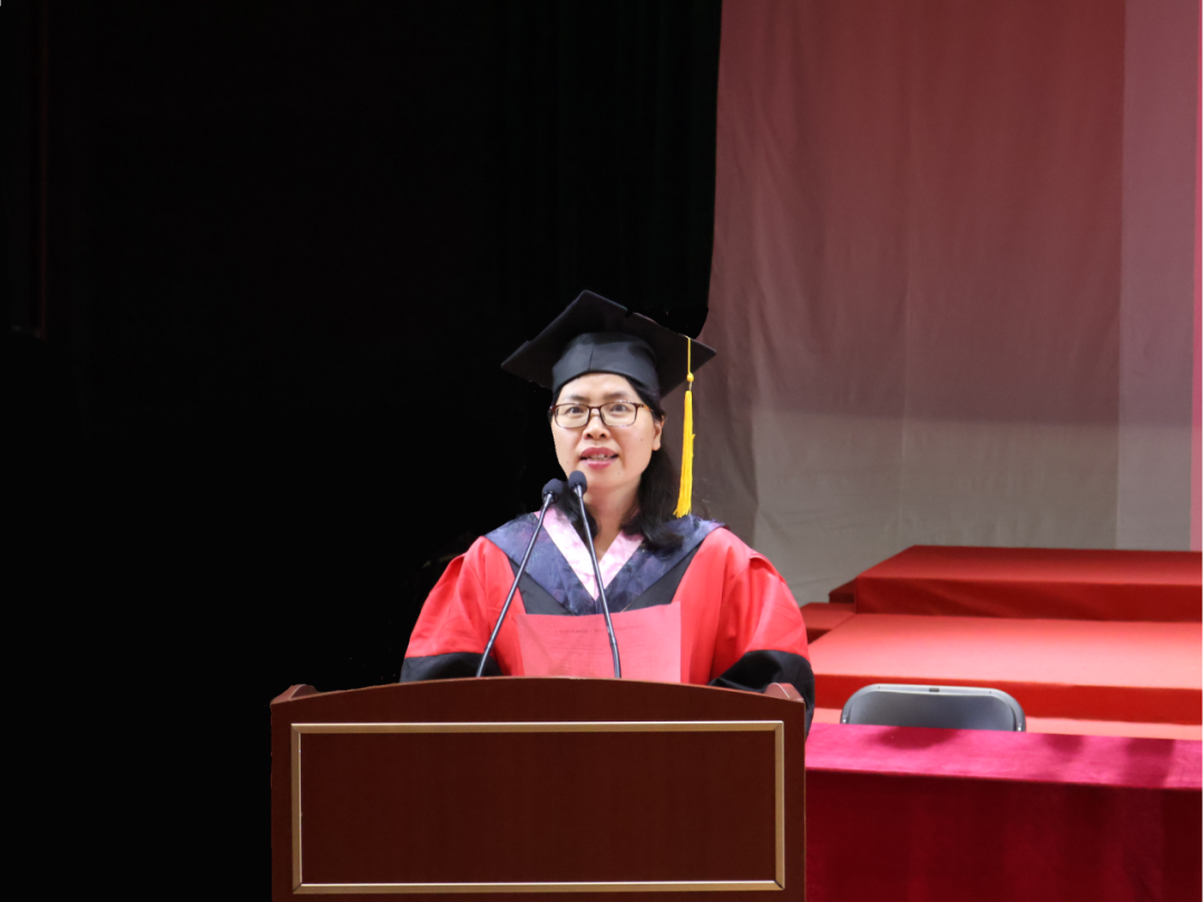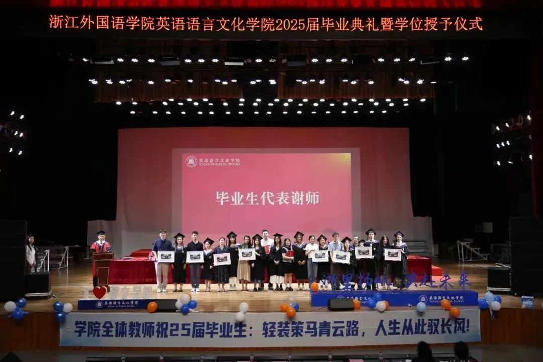 毕业生代表、2025届英语(师范)专业的胡馨宇带领大家一起回忆了在校期间诸多难忘而珍贵的瞬间,呼吁毕业生始终铭记校训院训,牢记浙外英文人的身份,不负韶华,继续前行。