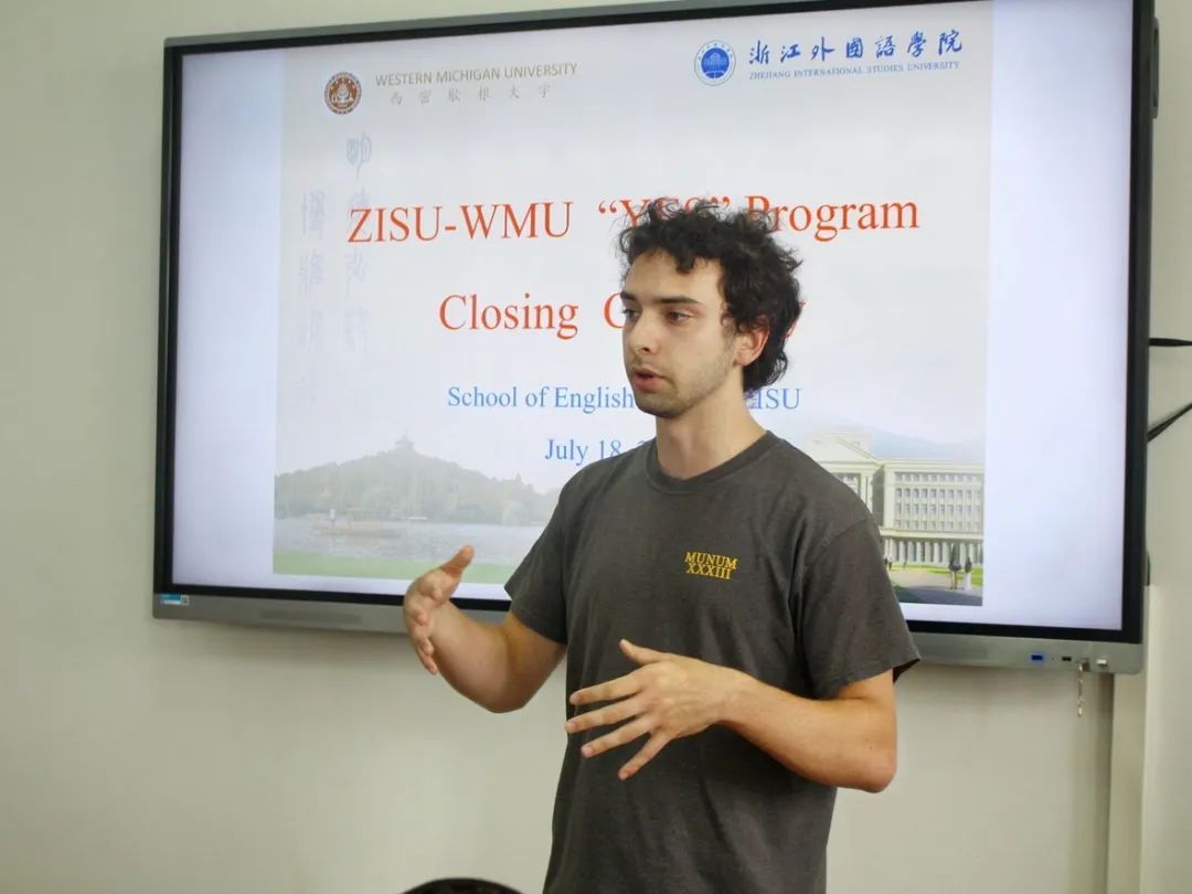 在交流互动环节,西密歇根大学项目员工大使Lucas Watson也分享了在杭州、在浙外的独特体验,对中方同学给予的帮助与支持表达了诚挚感谢。SummerLight英语演讲读写队队长、23翻译3班沈陈飞作为员工代表,生动讲述了与西密歇根大学同学携手学习、开展文化互鉴的难忘经历,充分展现了当代青年员工开放包容的国际交流态度。