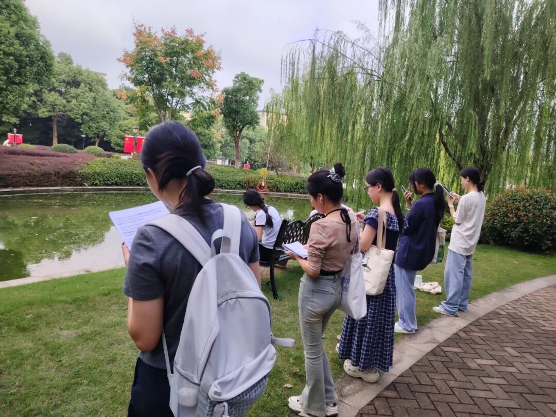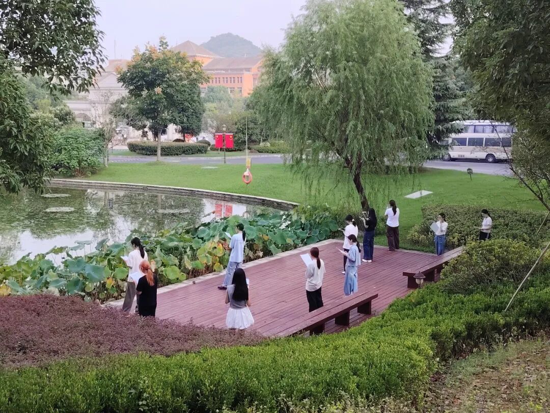 “这里没有教室的封闭感,清冷的空气格外提神,身边全是同学们的读书声,我能迅速把注意力集中在眼前的文章。”2025级英语专业的罗紫睿每天7:20准时到达湖边,短短几十分钟,她真切体会到“一日之计在于晨”的力量,也感受到语言魅力与浙外活力交织的独有氛围。