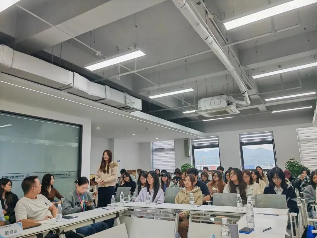 在参观饰品展示区时,师生们细致考察了商品的定价机制与市场销售状况。随后举行的交流座谈会上,语跃龙门公司杭州校区董事长戴林业系统介绍了“语跃龙门”公司的教学模式,并着重阐释了英语在商务实战中的具体应用。麟栩弘量科技CEO何麟毅则就全球贸易通集团及其外贸SAAS平台的功能与价值进行了分享。此外,相关专家围绕跨境电子商务中的“按需生产”(POD)模式做了专题讲解,指出该模式凭借订单驱动生产,有效实现了零库存、低风险与高利润,显著降低了行业运营门槛,并能充分满足市场的个性化定制需求。行业专家们的讲解引发了在场师生的热烈探讨。