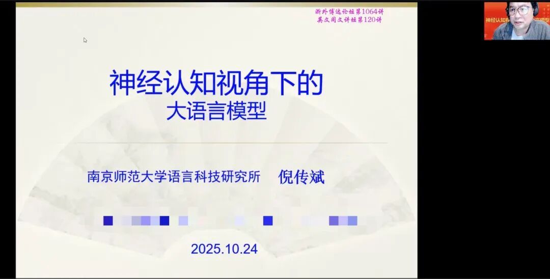 整场讲座兼具学术深度与实践价值:倪传斌以清晰的逻辑、通俗的表达,将复杂的神经认知理论与大语言模型技术相融合,既拓宽了师生们的学术视野,也为语言智能领域的跨学科研究提供了新视角。讲座在听众们的线上留言感谢中圆满落幕,大家纷纷表示,此次讲座为后续学术研究与教学实践提供了宝贵参考,将进一步探索神经认知理论与大语言模型在语言领域的创新应用。