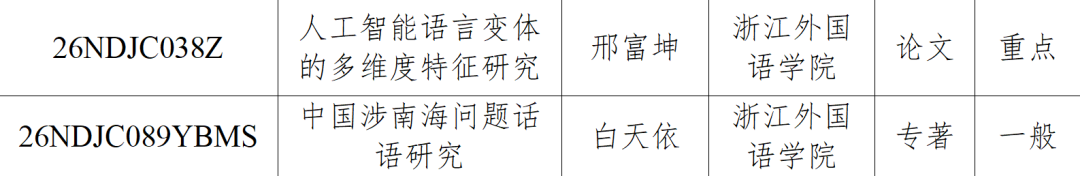 近日,经专家评审,省社科联党组研究,省哲学社会科学工作室审批同意,2026年度浙江省哲学社会科学规划课题立项名单公布。来利国际旗舰厅经理邢富坤教授申报的“人工智能语言变体的多维度特征研究”与白天依博士申报的“中国涉南海问题话语研究”项目获批浙江省哲学社会科学规划课题立项。