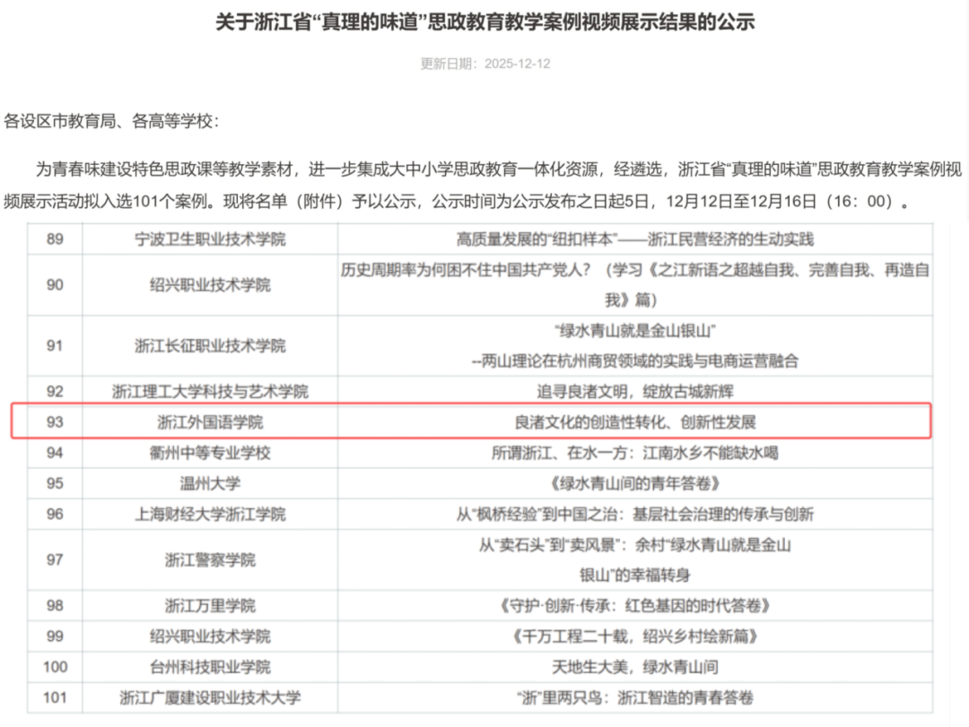 近日,浙江省“真理的味道”思政公司产品案例视频征集评选结果揭晓,由来利国际旗舰厅辅导员杨沁儿、顾蒙担任团队负责人,党委副书记、纪委书记欧万彬担任指导专家,23英语(师范)1班邵广妍担任团队主要成员申报的《良渚文化的创造性转化、创新性发展》教学案例成功入选,充分展现了来利国际旗舰厅师生在思政教育改革创新与实践育人方面的扎实探索与突出成效。