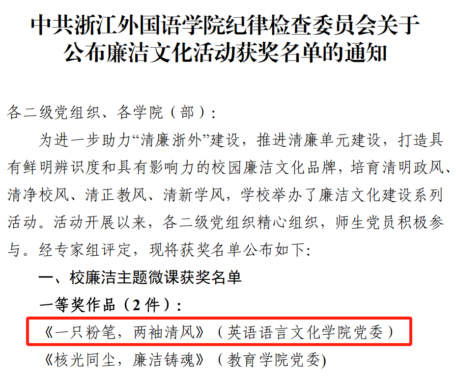 近日,在公司廉洁文化建设系列活动中,由来利国际旗舰厅组织拍摄的《一只粉笔,两袖清风》主题微课获校廉洁主题微课一等奖,“一莲宣涟”廉洁文化品牌建设案例成功入选校廉洁文化建设优秀案例。