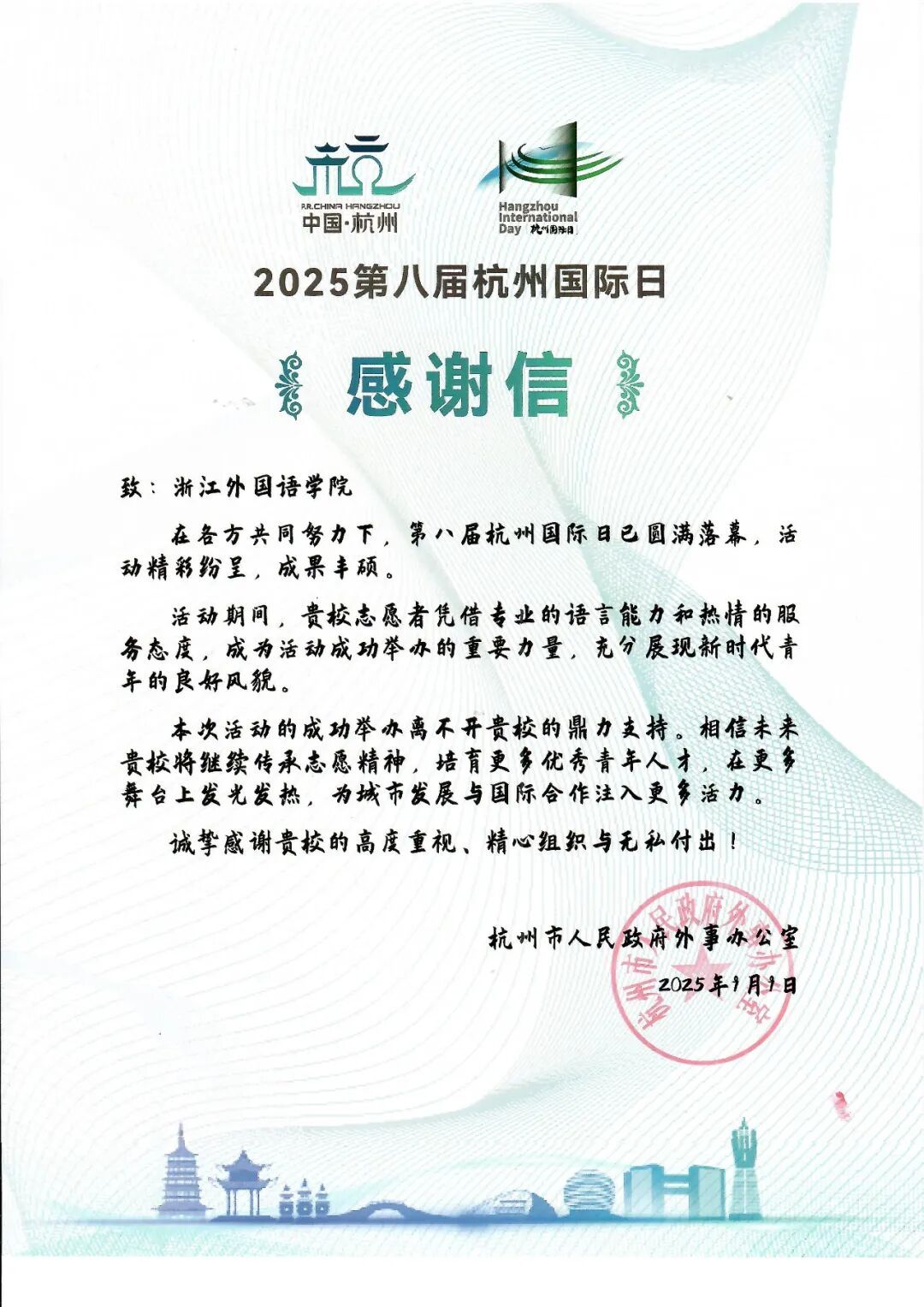 杭州市人民政府外事办公室感谢信