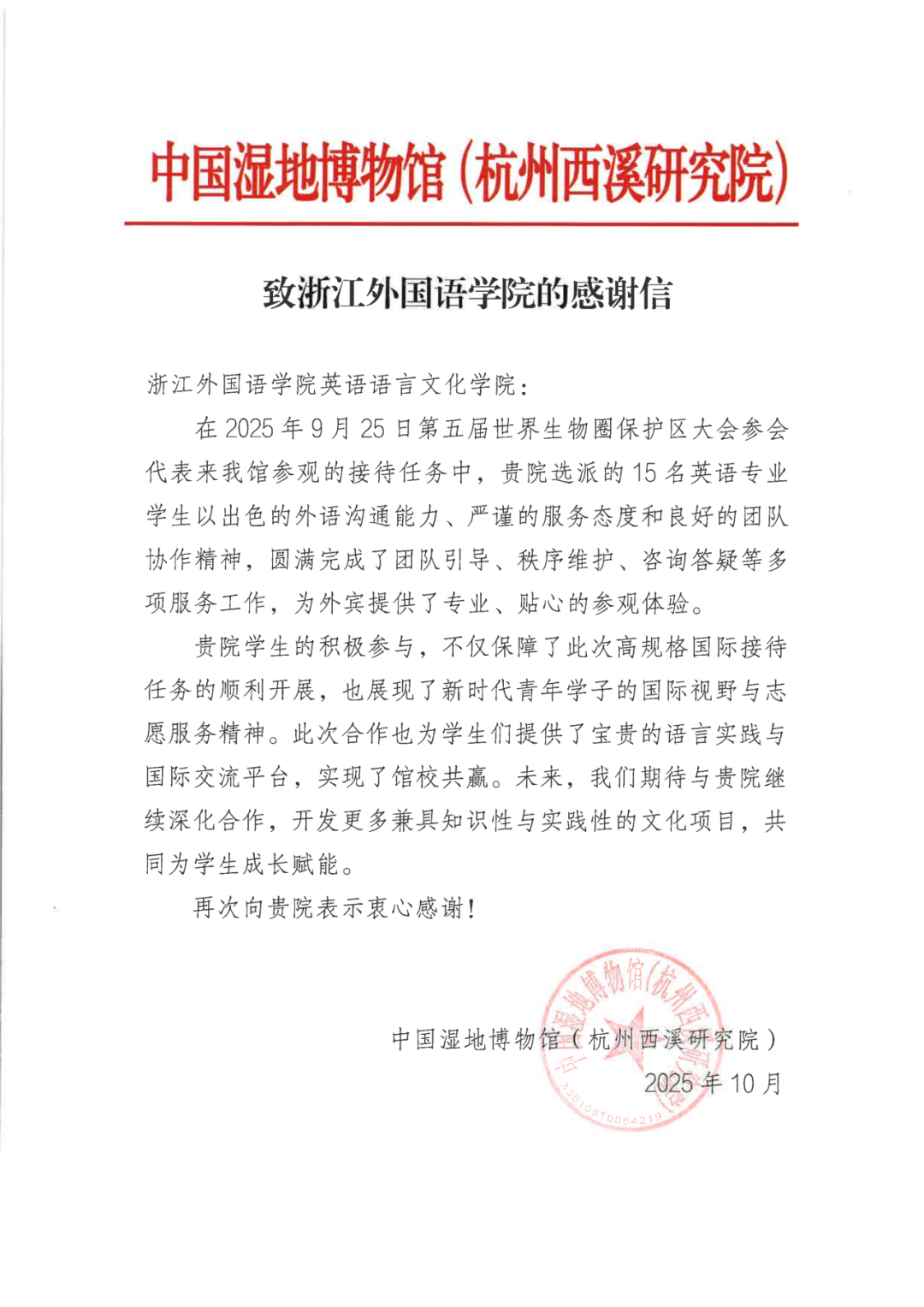 中国湿地博物馆(杭州西溪研究院)感谢信