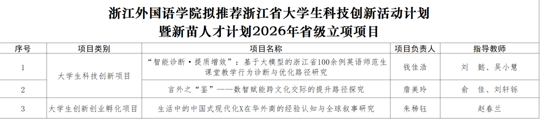 本次获批的5项项目紧扣外语学科,聚焦社会需求与行业发展,覆盖了大模型赋能课堂教学、数字技术提升跨文化交际、中国式现代化国际叙事、智能翻译技术应用以及跨文化法律服务等多个重点领域。项目充分展现了同学们对学术前沿的敏锐洞察和对社会发展的热切关注,也彰显了指导教师团队扎实的专业素养与深厚的科研根基。