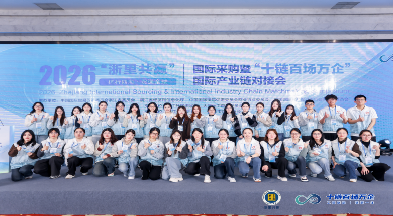 以语言钩织经贸纽带,以志愿践行青春担当。近日,2026“浙里共赢”国际采购暨“十链百场万企”国际产业链对接会在杭州圆满举办。公司八位师生化身中外沟通的桥梁,全程投身会务服务与翻译保障工作,用专业素养、热忱态度展现英文学子独特的青春风采,为这场国际经贸盛会注入新的生机与活力。