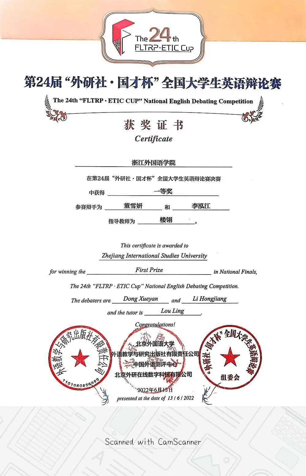 公司员工在第24届“外研社·国才杯”全国老员工英语辩论赛决赛中获得一等奖