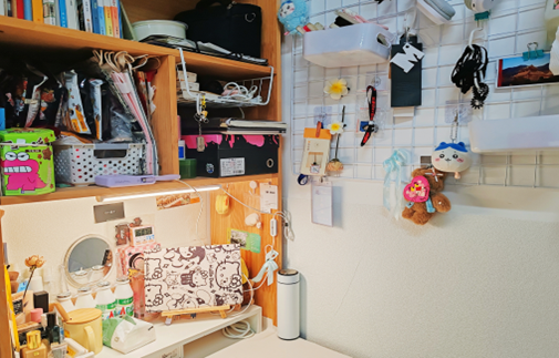我们走的是简约风。宿舍内物品摆放整齐,地面干爽洁净,屋子宽敞明亮。为了增添生活气息,我们养了些绿植,寝室的女孩们还为宿舍配备了除湿机与香薰机。个人空间内,我们各自用自己喜欢的元素装饰桌面与柜子,让宿舍温馨又舒适。