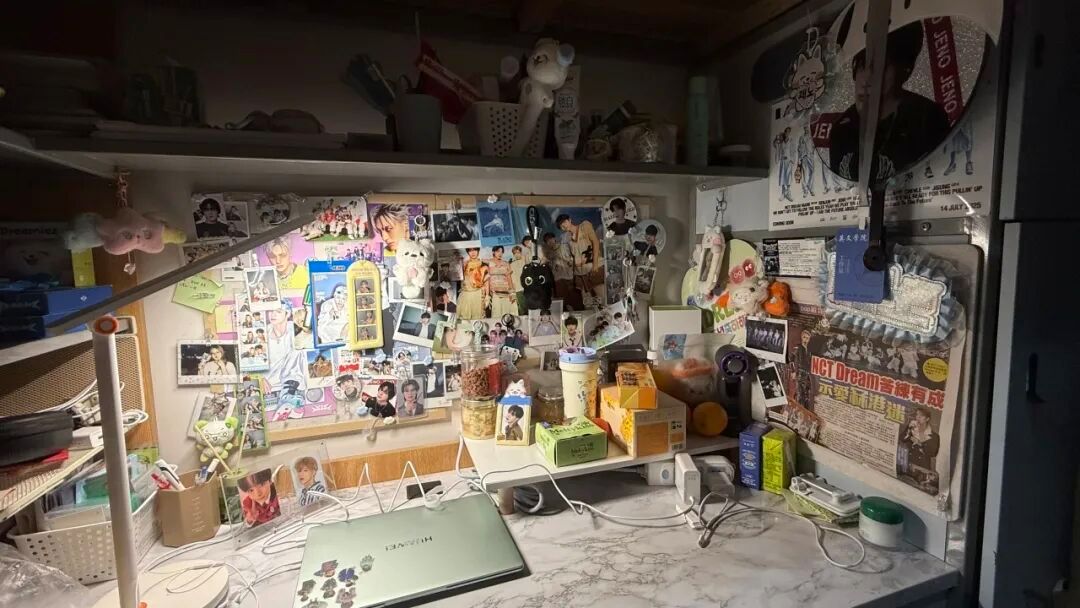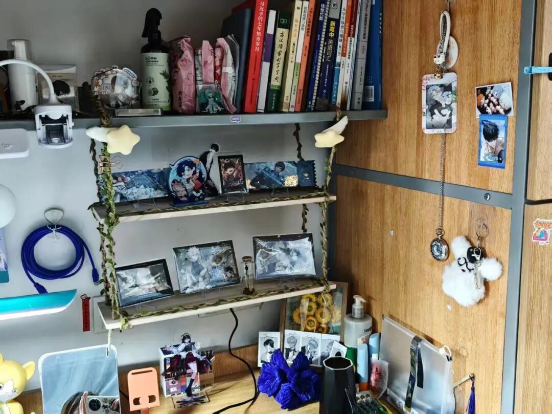 128是我们的温馨小窝:上下铺旁挂着软乎乎的衣被,书桌角落挤满可爱摆件,窗畔晒着生活气息的衣物,门上还有定期更换的鲜花。虽简约却满是暖意,是疲惫时的治愈港湾,藏着我们的日常小欢喜。