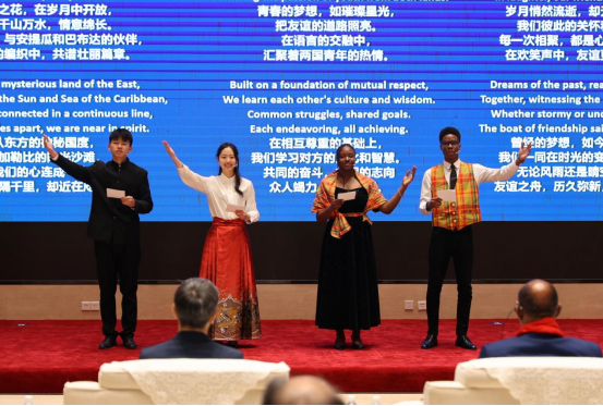 梁議匀(左二)为安提瓜和巴布达总理朗诵原创诗