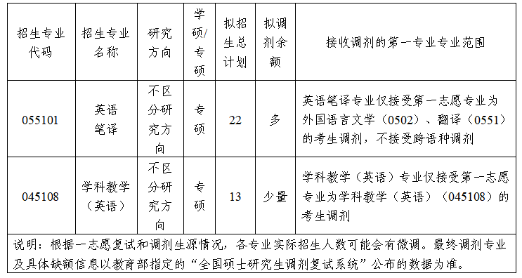 根据2026年公司招生计划和一志愿拟录取情况,公司英语笔译专业、学科教学(英语)专业均有部分调剂名额。欢迎有意向调剂公司的考生密切关注公司研究生招生网和公司网站。现将相关信息公告如下: