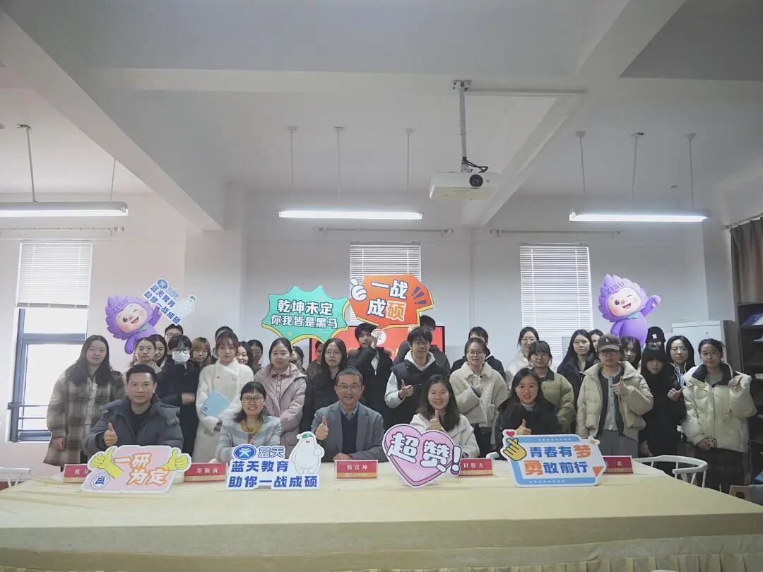交流活动后,师生合影留念,“全力以赴,一战成硕”的口号响亮而坚定,将温暖与信念凝聚在考研冲刺的最后时光。