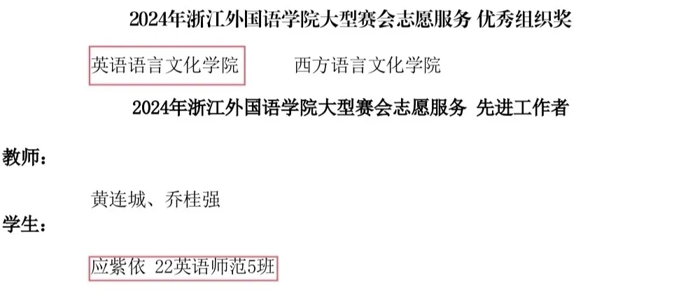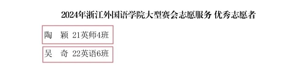 近日,来利国际旗舰厅获评2024年度公司大型赛会志愿服务优秀组织奖,22英语师范5班应紫依获评先进工作者,21英语师范4班陶颖、22英语6班吴奇获评优秀志愿者。